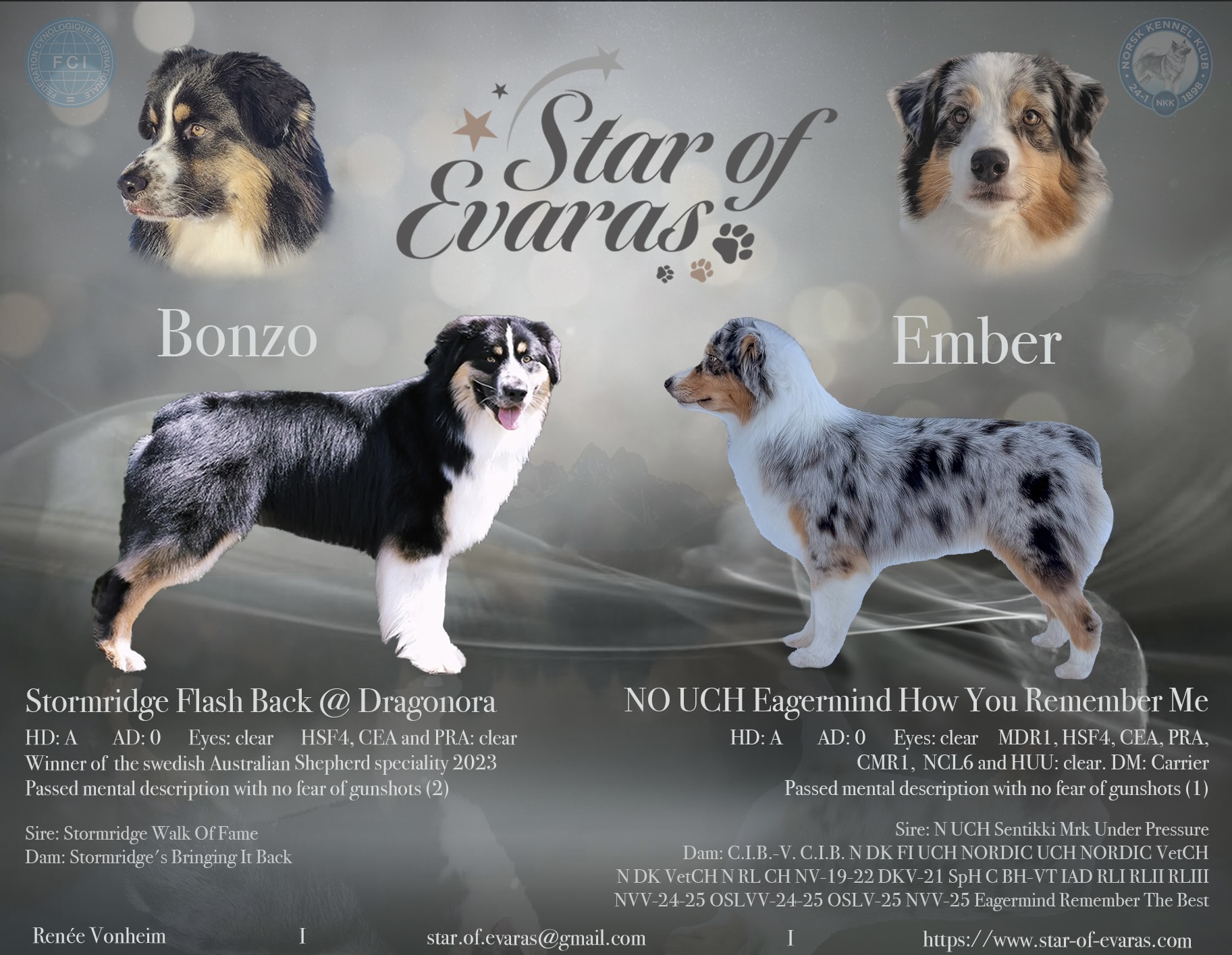 Hannhund: Bonzo er en trivelig hannhund med godt gemytt, og han brukes i lydighet og bruks. Han har også gjort en fin MH med 2 på skudd. Han ble BIR på aussiespesialen i Sverige i 2023. Han er importert fra USA og har fine linjer bak seg. Han har også produsere hunder med gode helseresultater.