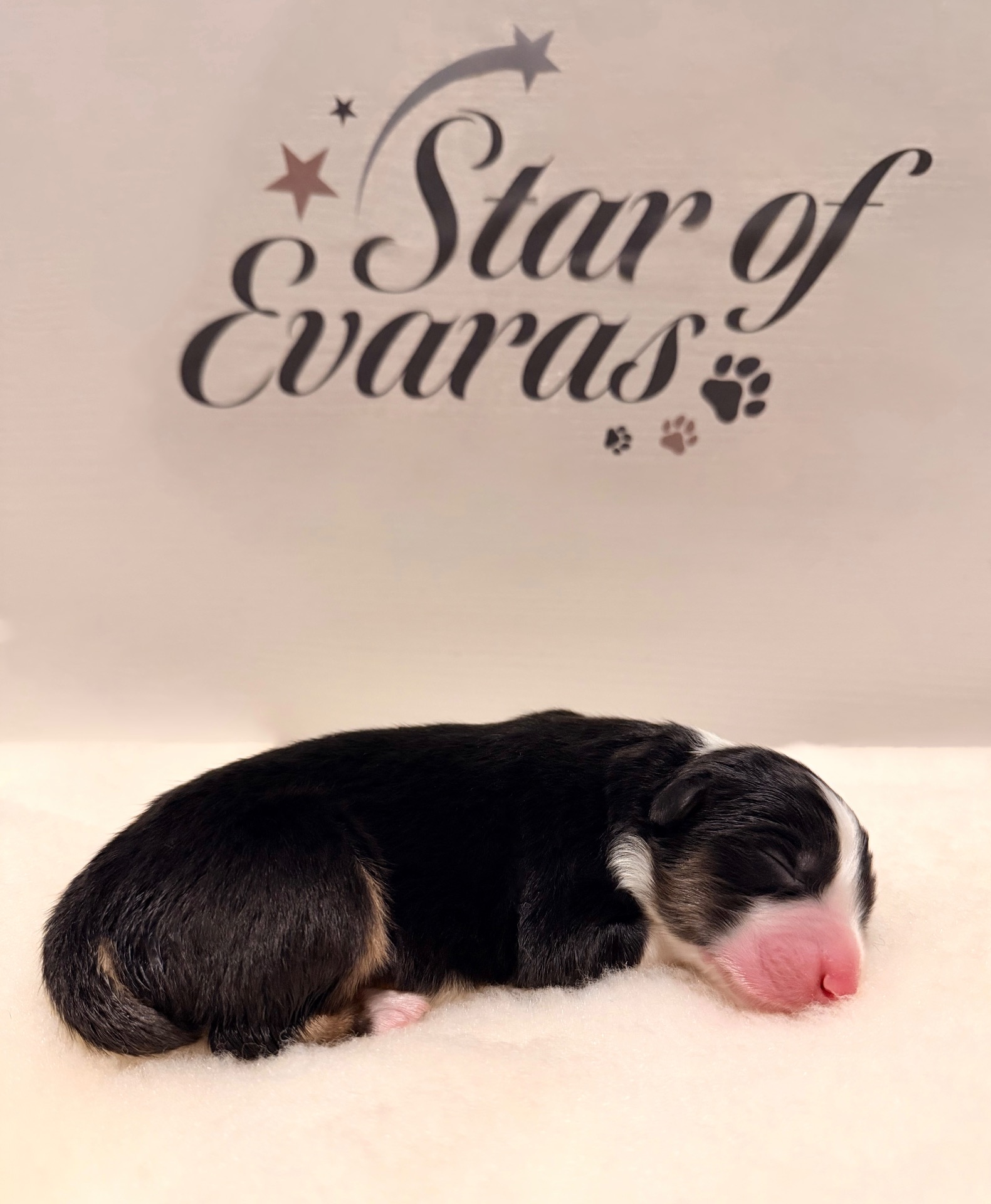 17.11.2025 kom vårt magiske kull fra Alfa og Damon. Det ble født 2 tricolor hannvalper med NBT, men den første var dessverre død da fostersekken var gått hull på. Den andre var full av liv med en gang. Han legger godt på seg og vi gleder oss til å følge med på utviklingen. Alfa er en fantastisk mamma og hun tar godt vare på valpen sin. Hun elsker å være i valpekassen og er der så mye som mulig.
